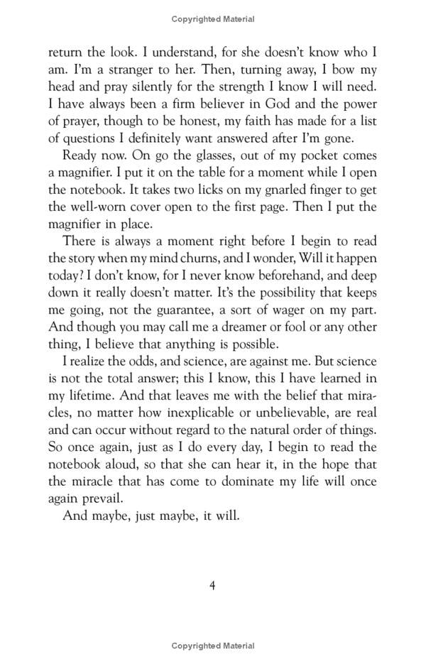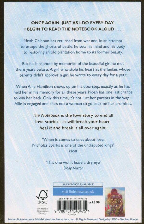 When Allie Hamilton shows up on his doorstep, exactly as he has held her in his memory for all these years, Noah has one last chance to win her back. Only this time, it's not just her parents in the way — Allie is engaged and she's not a woman to go back on her promises.