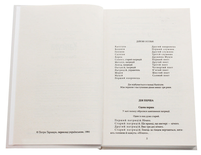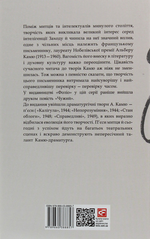 До видання увійшли драматургічні твори А. Камю — п’єси 'Калігула' (1944), 'Непорозуміння' (1944), 'Стан облоги' (1948), 'Справедливі' (1949), в яких виразно відбилася еволюція його творчості. Вони й сьогодні з успіхом йдуть на багатьох театральних сценах і яскраво демонструють непересічний талант Камю-драматурга.SPECIFICATIONS: