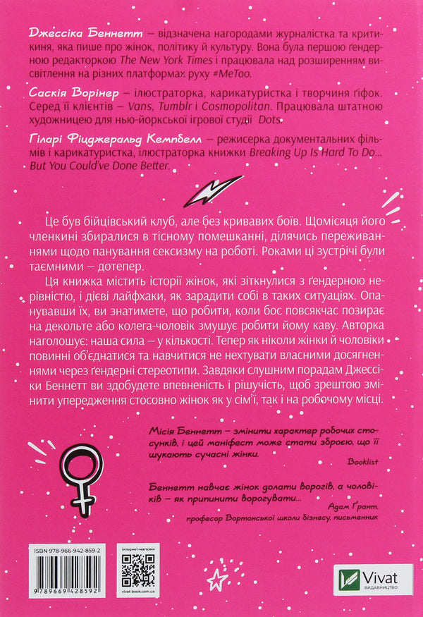 Роками ці зустрічі були таємними — дотепер.Ця книжка містить історії жінок, які зіткнулися з ґендерною нерівністю, і дієві лайфхаки, як зарадити собі в таких ситуаціях. Опанувавши їх, ви знатимете, що робити, коли бос повсякчас позирає на декольте або колега-чоловік змушує робити йому каву. Авторка наголошує: наша сила — у кількості. Тепер як ніколи жінки й чоловіки повинні об’єднатися та навчитися не нехтувати власними досягненнями через ґендерні стереотипи. Завдяки слушним порадам Джессіки Беннетт ви здобудете впевненість і рішучість, щоб зрештою змінити упередження стосовно жінок як у сім’ї, так і на робочому місці.SPECIFICATIONS: