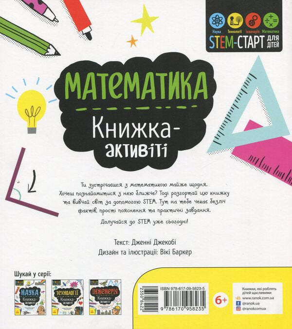 STEM — це напрям в освіті, який навчає дітей природничим наукам, технологіям, математиці та інженерії. Виконуючи завдання з цієї книжки, дитина засвоїть необхідні базові знання з математики і застосує їх на практиці. Вона дізнається, як вимірюють довжину, що таке прямий кут та як створити власний код.