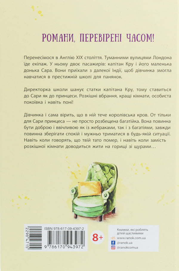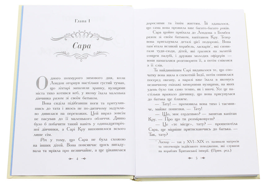 Сара Кру — семирічна дівчинка, яка сприймає світ як доросла людина. Улюблене заняття Сари — читати книжки і складати власні історії. Але жодні вподобання дівчинки не зрівняються з її любов’ю до батька — капітана Кру. Добра і сором’язлива Сара завжди вміла бачити людей наскрізь. Так, вона з першої зустрічі розпізнала в директорці школи, куди її влаштував батько, нещиру і жорстоку жінку. Своє справжнє обличчя директорка розкриває, щойно до школи приносять звістку про смерть батька Сари, яка залишається на неї без жодного пенса.