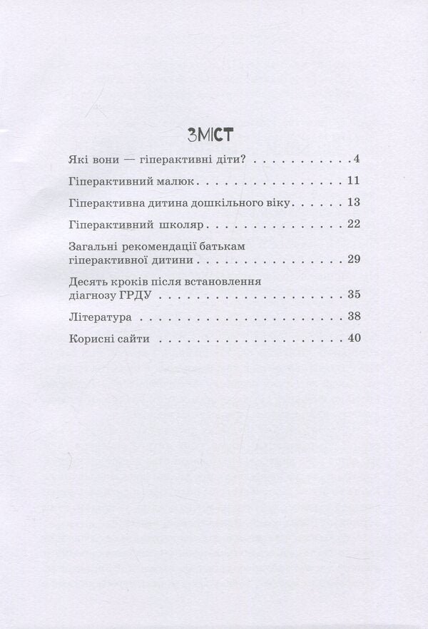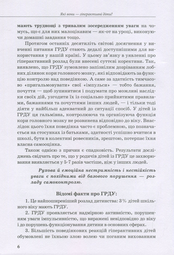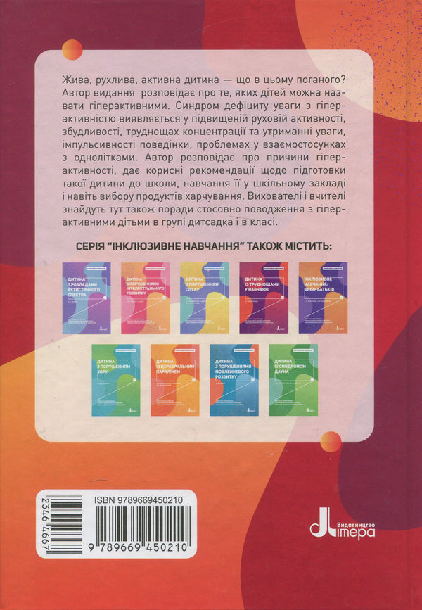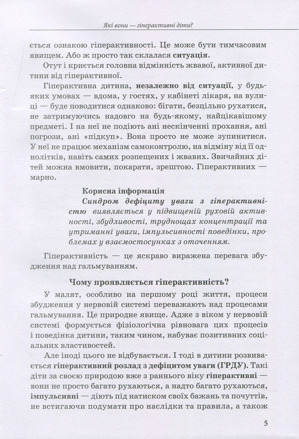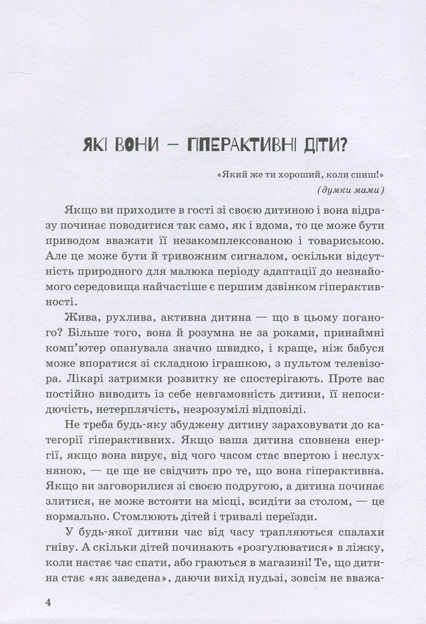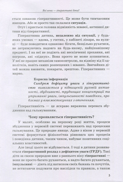 Жива, рухлива, активна дитина – що в цьому поганого? Автори посібника розповідають про те, яких дітей можна назвати гіперактивними. Синдром дефіциту уваги з гіперактивністю виявляється у підвищеній руховій активності, збудливості, труднощах концентрації та утриманні уваги, імпульсивності поведінки, проблемах у взаємостосунках з однолітками. Автор розповідає про причини гіперактивності, надає корисні рекомендації щодо підготовки такої дитини до школи, навчання її у шкільному закладі і навіть вибору продуктів харчування. Учителі і вихователі знайдуть тут поради стосовно поводження з гіперактивними дітьми в класі.