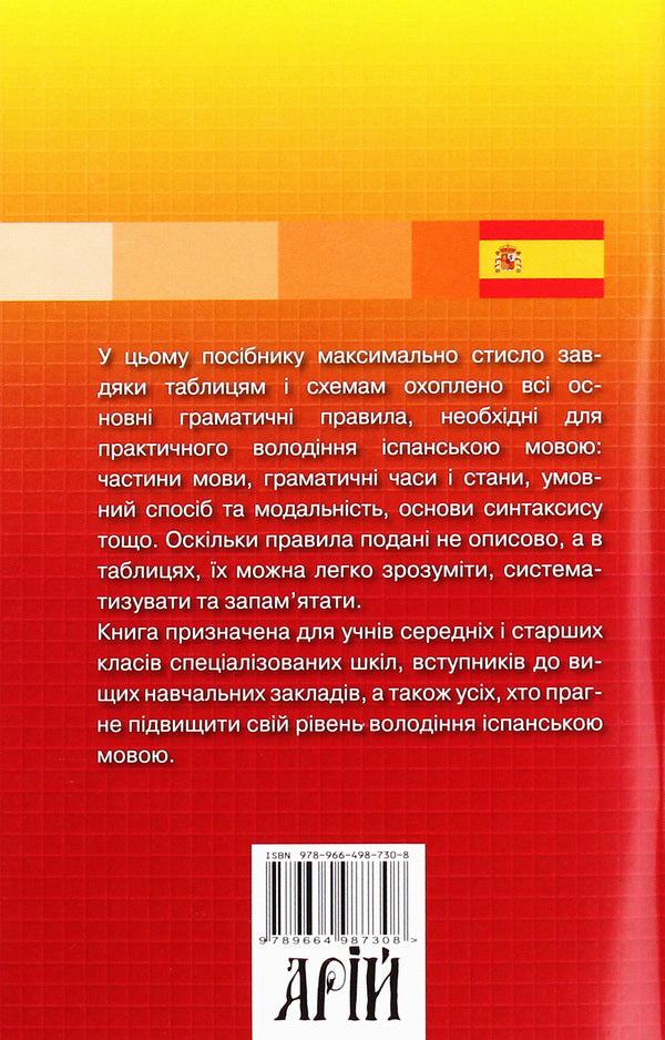 У цьому посібнику максимально стисло завдяки таблицям і схемам охоплено всі основні граматичні правила, необхідні для практичного володіння іспанською мовою: частини мови, граматичні часи і стани, умовний спосіб та модальність, основи синтаксису тощо. Усі правила проілюстровано прикладами. До книги додається словничок.