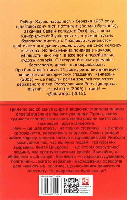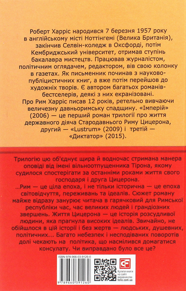 Про Рим Харріс писав 12 років, ретельно вивчаючи величезну давньоримську спадщину. 'Імперій' (2006) – це перший роман трилогії про життя державного діяча Стародавнього Риму Цицерона, другий - 'Lustrum' (2009) і третій 'Диктатор' (2015).Трилогію цю об'єднує щира й водночас стримана манера оповіді від імені вільноотпущенника Тірона, якому судилося спостерігати за останніми роками життя свого господаря і друга Цицерона.…Рим - це ціла епоха, і не тільки історична - це епоха світовідчуття, переживань та ідеалів. Сюжет роману майже відразу занурює читача в гарячковий для Римської республіки час, час великих людей і грандіозних звершень. Життя Цицерона – це історія розсудливої людини, яка прагнула високих ідеалів. Звичайно, не обійшлося в цій історії і без жертв - людських, душевних, політичних... Багато небезпек і несподіваних поворотів долі чекають на політика, що насмілився домагатися консулату. Чи виправдано було все це? Цицерон сказав би не замислюючись: так!SPECIFICATIONS: