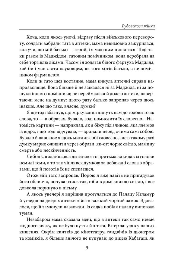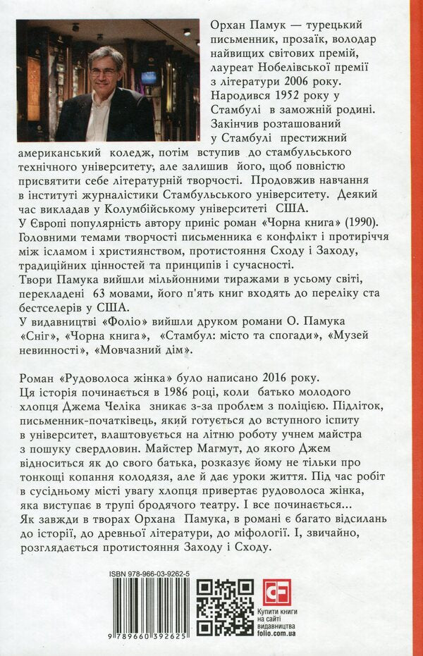 Як завжди в романах Орхана Памука, тут багато відсилань до історії, до древньої літератури, до міфології. Без протистояння Заходу і Сходу теж не обійшлося.Можна впевнено сказати, що 'Руда жінка' — це роман-притча,це роман в романі,де тісно переплелися театр і реальність, легенда і міф, метафора і дійсність, Схід і Захід, батько та син, релігія і атеїзм — отже, життя та смерть.SPECIFICATIONS: