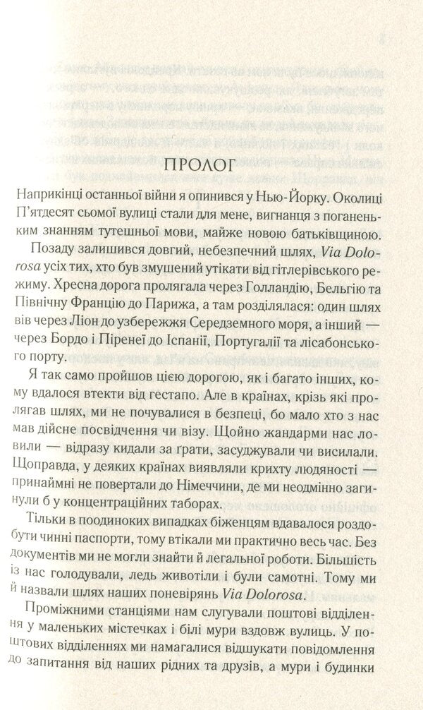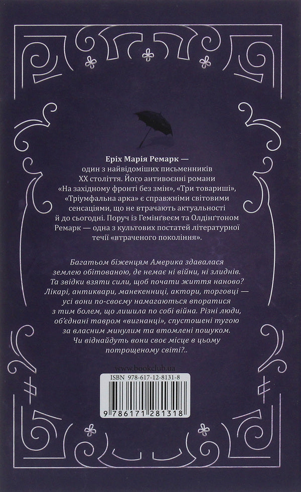 Багатьом біженцям Америка здавалася землею обітованою, де немає ні війни, ні злиднів. Журналіст Роберт Росс два роки переховувався від нацистів у Брюссельському музеї. Тепер він може вдихнути на вільні груди. Та де взяти сили, щоб почати життя наново? Роберт не один. Він бачить долі інших біженців. Лікарі, торговці картинами, манекенниці, актори — усі вони по-своєму намагаються впоратися з тим болем, що лишила по собі війна. Хтось топить горе в алкоголі, хтось кидається в роботу. Одні продовжують боротьбу з останніх сил. Інші складають зброю. Різні люди, об’єднані тавром 'вигнанці', спустошені тугою за власним минулим та втомлені пошуком. Чи віднайдуть вони своє місце в цьому потрощеному світі?..