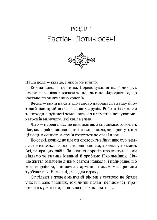 Машині поклоняються. Жерці, які служать їй від народження, не стільки здатні бачити майбутнє, скільки зазирають у минуле. Її передбачень чекають з острахом, намагаючись розгадати знаки, які вона посилає. У постапокаліптичному світі роману Дарії Піскозуб людство знову живе в племенах, які воюють одне з одним за виживання, а загадкова Машина — все, що лишилося від цивілізації. Хтось хоче її олюднити, хтось бореться проти неї, але вона вічна і, здається, спроможна знищити те, що мала би оберігати…