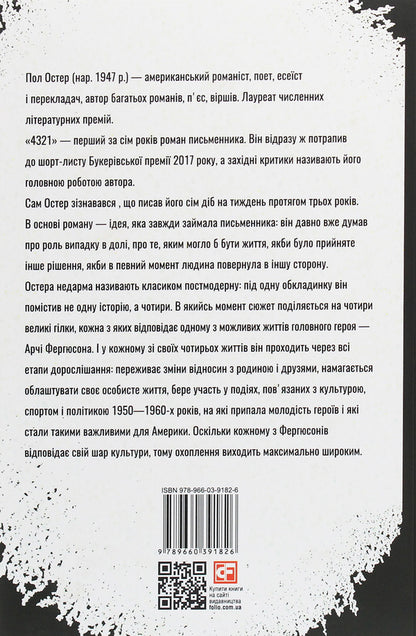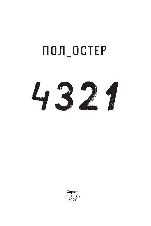 '4321' - перший за сім років роман письменника. Він відразу ж потрапив до шорт-листу Букерівської премії 2017 року, а західні критики називають його головною роботою автора.Сам Остер зізнавався, що писав його сім діб на тиждень протягом трьох років.В основі роману - ідея, яка завжди займала письменника: він давно вже думав про роль випадку в долі, про те, яким могло б бути життя, якби було прийнято інше рішення, якби в певний момент людина повернула в іншу сторону.Остера не дарма називають класиком постмодерну: під одну обкладинку він помістив не одну історію, а чотири. В якийсь момент сюжет поділяється на чотири великі гілки, кожна з яких відповідає одному з можливих життів головного героя - Арчі Фергюсона. І у кожному зі своїх чотирьох життів він проходить через всі етапи дорослішання: переживає зміни відносин з родиною і друзями, намагається облаштувати своє особисте життя, бере участь у подіях, пов'язаних з культурою, спортом і політикою 1950-1960-х років, на які припала молодість героїв і які стали такими важливими для Америки. Оскільки кожному з Фергюсонів відповідає свій шар культури, тому охоплення виходить максимально широким.SPECIFICATIONS: