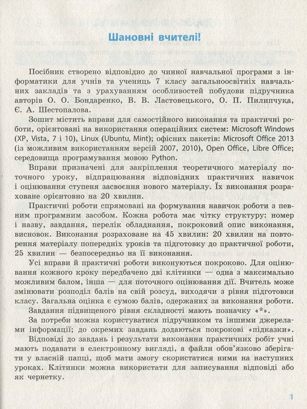 Посібник створено відповідно, до вимог чинної навчальної програми з інформатики: для 7 класу загальноосвітніх навчальних закладів та з урахуванням особливостей побудови підручника авторів О. О. Бондаренко, В. В. Ластовецького, О. П. Пилипчука, Є. А. Щестопалова.