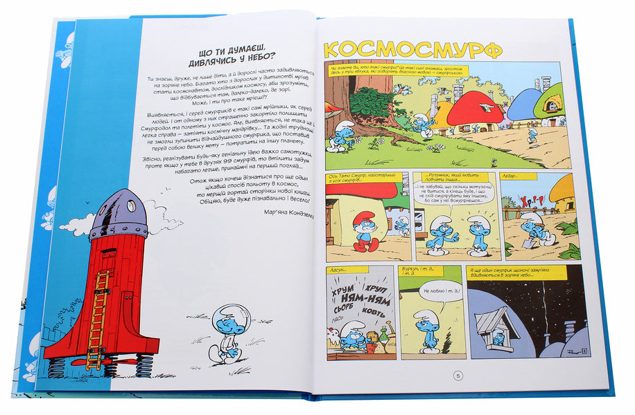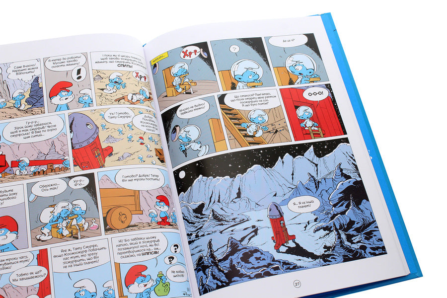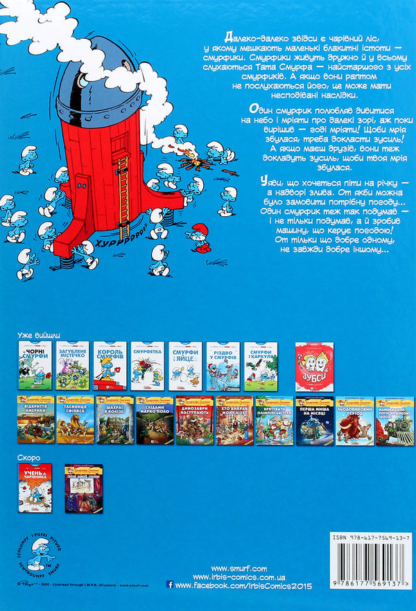 КосмосмурфОдин смурфик любив дивитися на небо і мріяти про далекі зорі, аж поки вирішив — годі мріяти! Щоби мрія збулася, треба докласти зусиль! А якщо маєш друзів, вони теж докладуть зусиль, щоби твоя мрія збулася. Машина для смурфування погодоюУяви, що хочеться піти на річку — а надворі злива. От якби можна було замовити потрібну погоду... Один смурфик теж так подумав — і не тільки подумав, а й зробив машину, що керує погодою! От тільки що добре одному, не завжди добре іншому...SPECIFICATIONS: