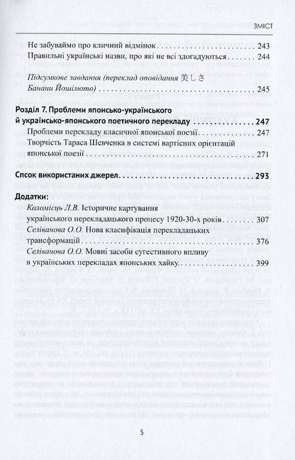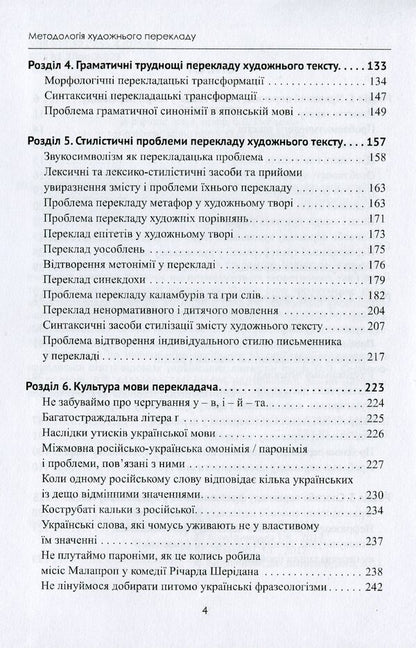 Окрім суто теоретичних положень перекладознавства, він містить розділи, присвячені висвітленню лексичних, граматичних, стилістичних труднощів художнього перекладу прозових і поетичних японських текстів, проблемам перекладу фразеологізмів, описовий перелік типових помилок перекладачів тощо.Як додаток до навчального посібника за люб’язної згоди авторів наводяться статті відомих українських лінгвістів проф. О. О. Селіванової та проф. Л. В. Коломієць, які містять надзвичайно цінний матеріал, пов’язаний із загальною проблематикою посібника.SPECIFICATIONS: