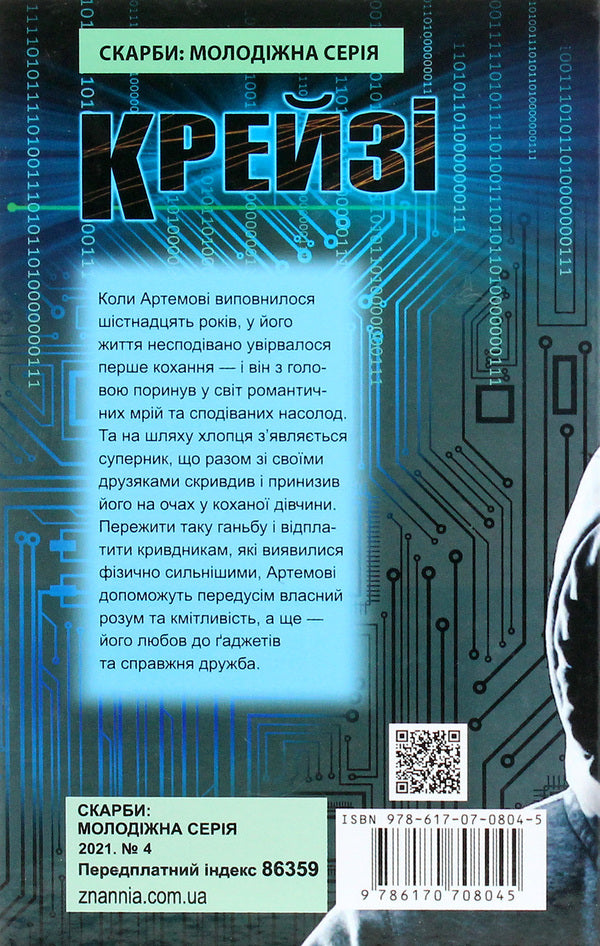 Повість “Крейзі” — новий твір відомого сучасного українського письменника Сергія Гридіна, майстра психологічної прози для юнацтва. Це історія 16-річного хлопця, який живе у комп’ютерному світі й не уявляє свого життя без ґаджетів. Він почуває себе цілком щасливою людиною, допоки не зустрічає перше кохання, яке не лише дарує йому приємні миті, а й приносить перші серйозні випробування: на фізичну силу, моральність і гідність, кмітливість та винахідливість. Ось тут Артемові й знадобляться усі його досі набуті вміння. Але, як виявиться, часом важливою є не тільки сама перемога, як здобутий людиною досвід і справжні друзі.