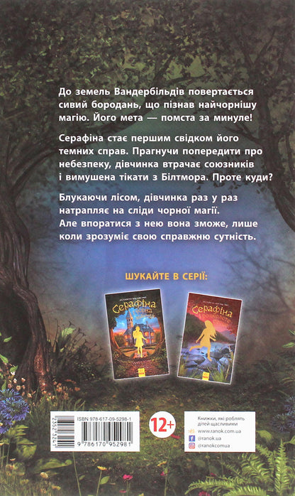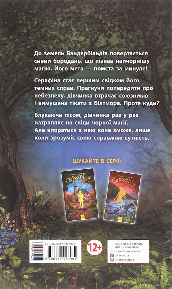 Серафіна прокидається у темному місці, у подертому одязі та із загоєними ранами. Щось трапилося з нею, проте Сера не пам’ятає що саме. Блукаючи лісом, дівчинка помічає, що ліс швидко змінюється: річки піднімаються, бурі не вщухають, а повені наносять неабияких збитків. Вона знає: до цього причетна чорна магія.Відтак вона має попередити всіх і зупинити те, що наближається до Білтмора. Та це виявляється не так уже й легко…Книга 3. Серафіна і Витий посох