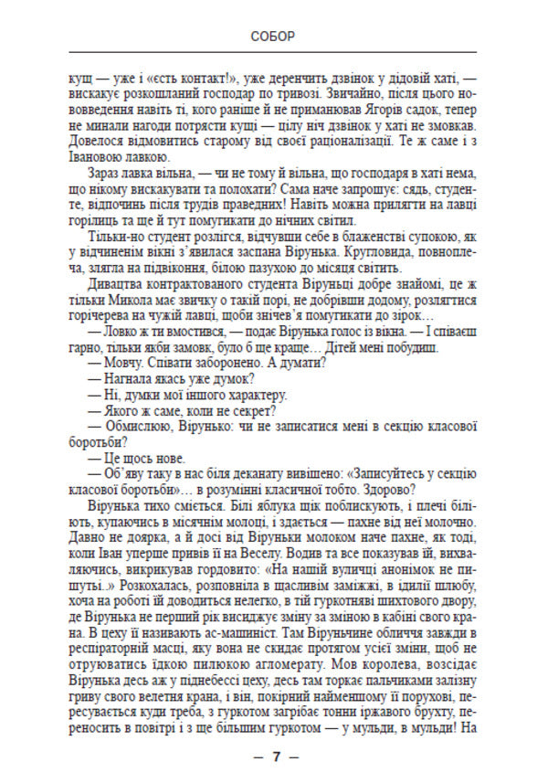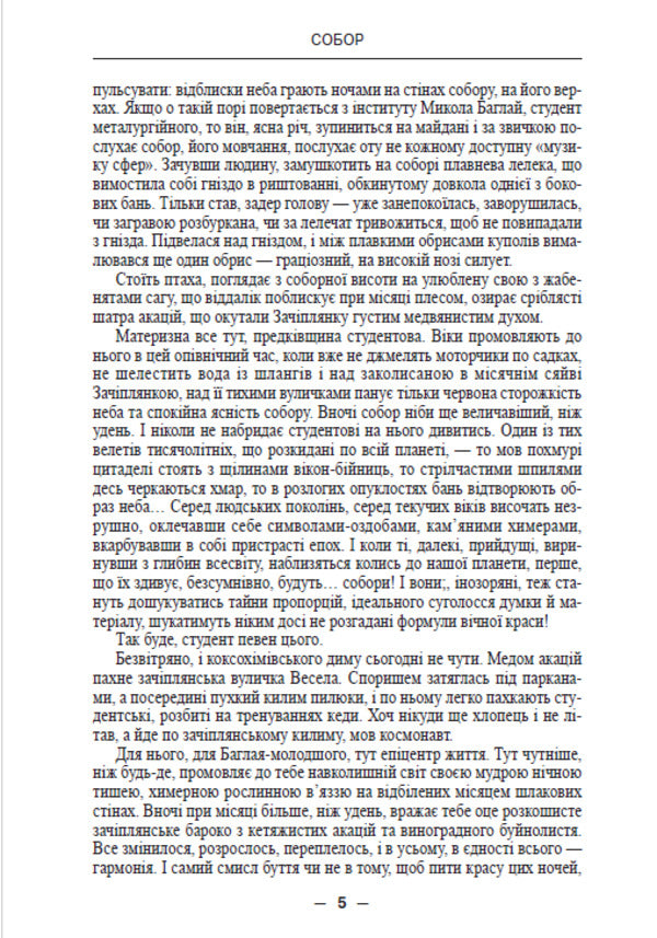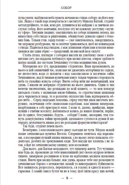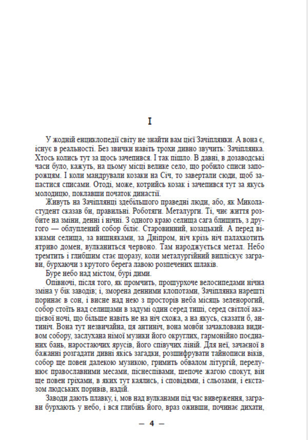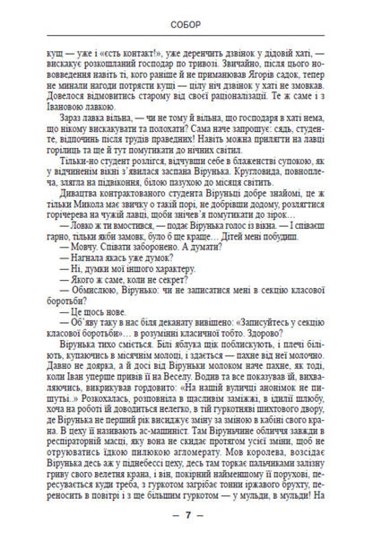 Події роману 'Собор' розгортаються у середині ХХ сторіччя у селищі Зачіплянка. Серце Зачіплянки — давній собор, який був зведений ще запорізькими козаками і відтоді був мовчазним свідком зміни епох і владарів. Собор обертали на склад зброї, на сховище для комбікорму… Колись величний, а тепер — обшарпаний та вицвілий, він чекає на нову долю. Місцеві горе-керівники жадають знести собор і побудувати на його місці 'кафе для трудящих'. На захист собору стають студент Микола та дівчина Єлька, у серцях яких ще живуть справжні почуття та щирі мрії...