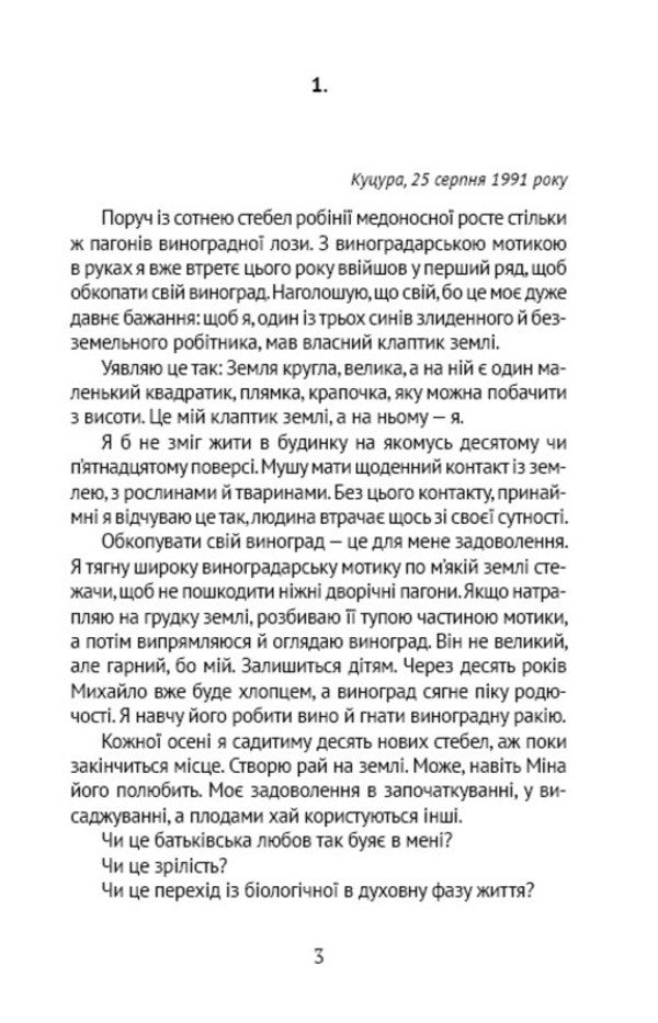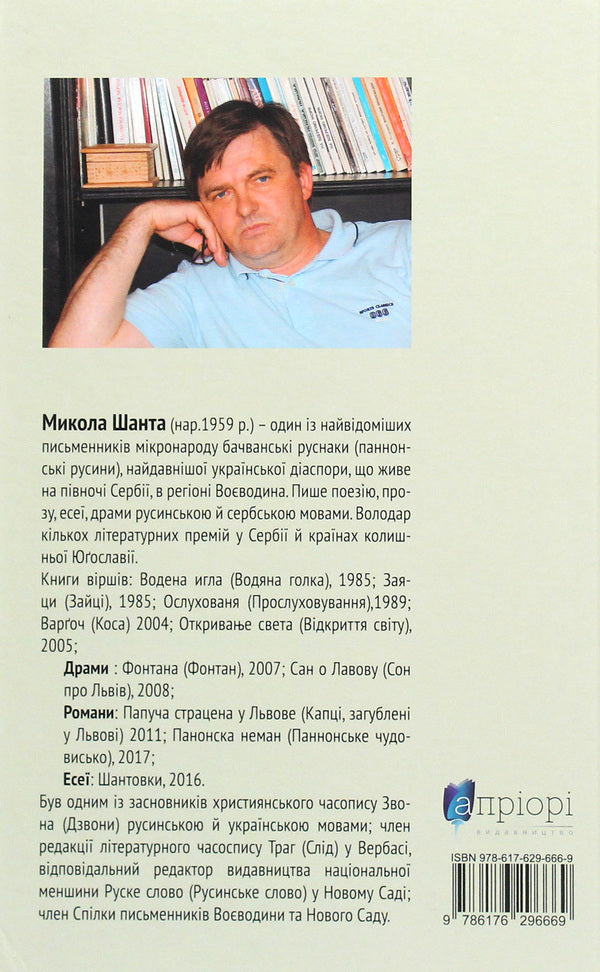 У романі Миколи Шанти, представника найдавнішої української діаспори – бачванських русинів, що живуть на теренах колишньої Юґославії, подано панорамну картину життя цієї спільноти в бурхливому ХХ столітті; через призму русинської громади читач має змогу побачити історичне тло воєн на Балканах та поставити перед собою віковічні питання про людську гідність і мораль, про долю особистості, яка не з власної волі опинилася поміж двох вогнів ворогуючих націоналізмів.