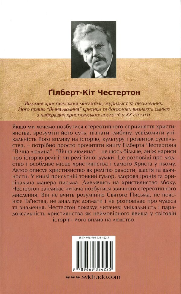 'Вічна людина' — це щось більше, аніж нариси про історію релігії чи релігійної думки. Це розповіді про людство і особливе місце християнства і самого Христа у ньому. Автор описує християнство, як релігію радості, щастя та вдячності. У книзі присутній тонкий гумор, здорова іронія та оригінальна манера письма.Дивлячись на християнство збоку, Честертон закликає читача позбутися звичного стереотипного мислення. Він не вчить розумінню Святого Письма, не пояснює Таїнства, не нищить догмати і не розповідає про чудеса знамення. Честертон показує читачеві унікальність і парадоксальність християнства як неймовірного явища у світовій історії і його вплив на розвиток людства.SPECIFICATIONS: