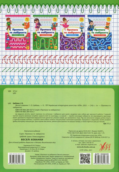 Це видання містить прості прописи по клітинках і лабіринти для малят, розділені між собою для зручності роботи. У верхній частині зошита малюкам потрібно навести лінії по пунктиру, а в нижній — пройти нескладні лабіринти, які відповідають кругозору малят: допомогти тваринкам відшукати їхніх дитинчат, провести звірів до хованок тощо.