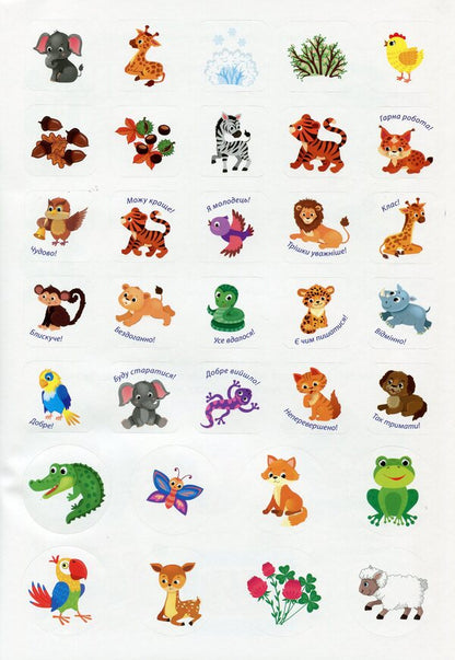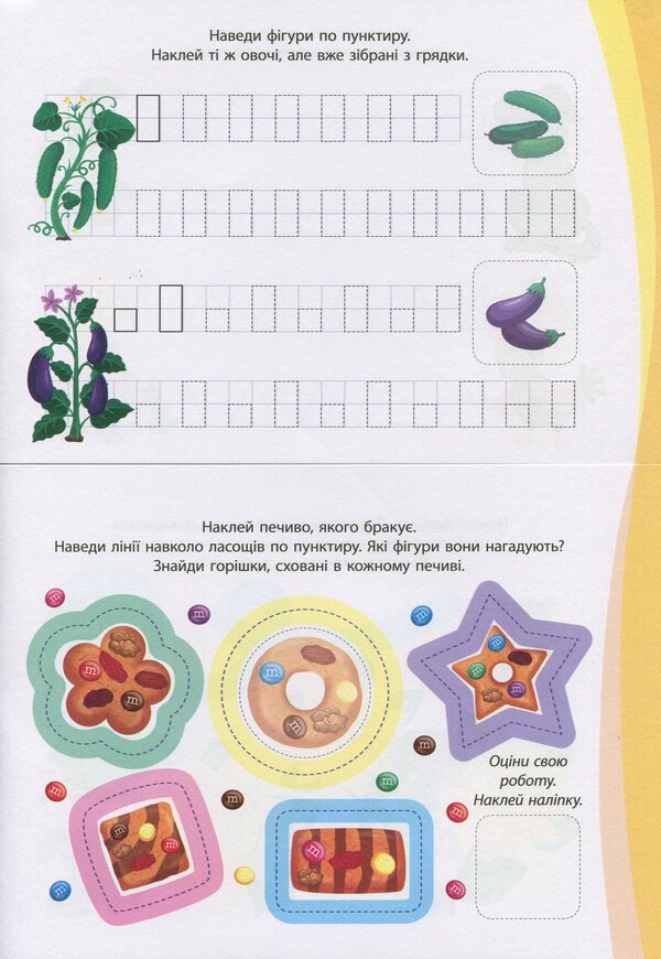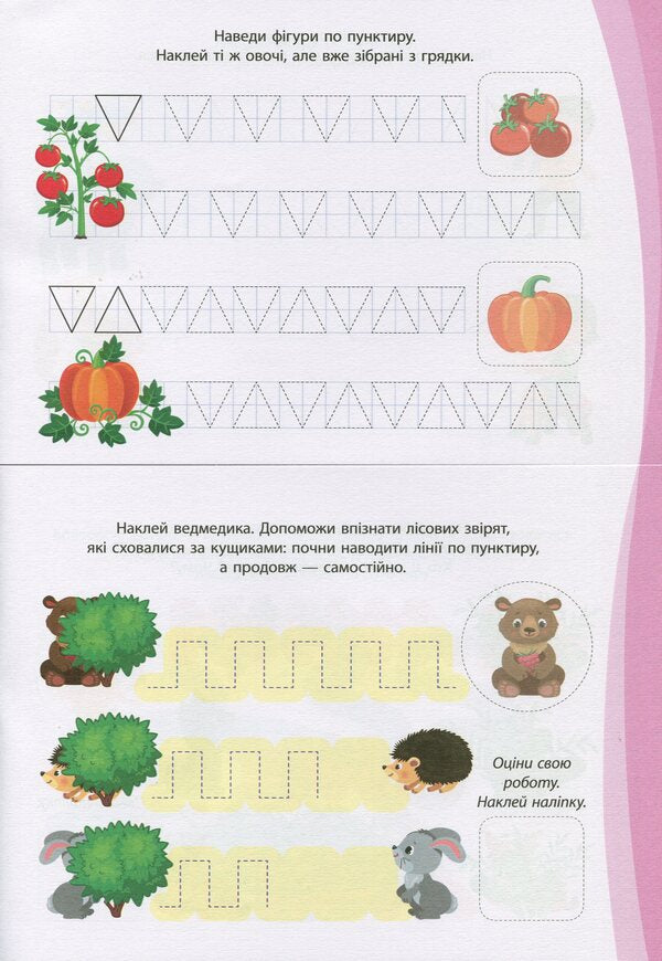 Під час виконання завдань дітям стануть у пригоді яскраві наліпки, а оцінити свою роботу можна спеціальними наліпками-оцінками.Працюючи з виданням, малюк розвине дрібну моторику пальців рук, просторове мислення, уміння орієнтуватися на аркуші паперу, а також підготує руку до письма.SPECIFICATIONS: