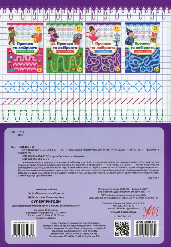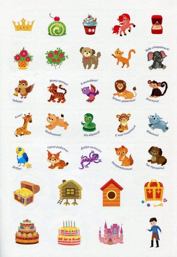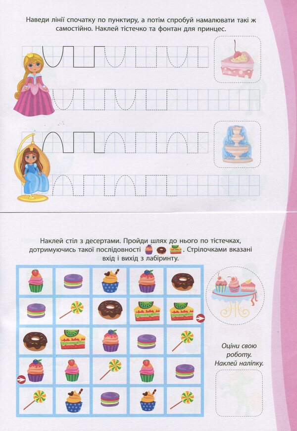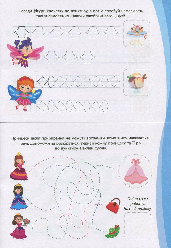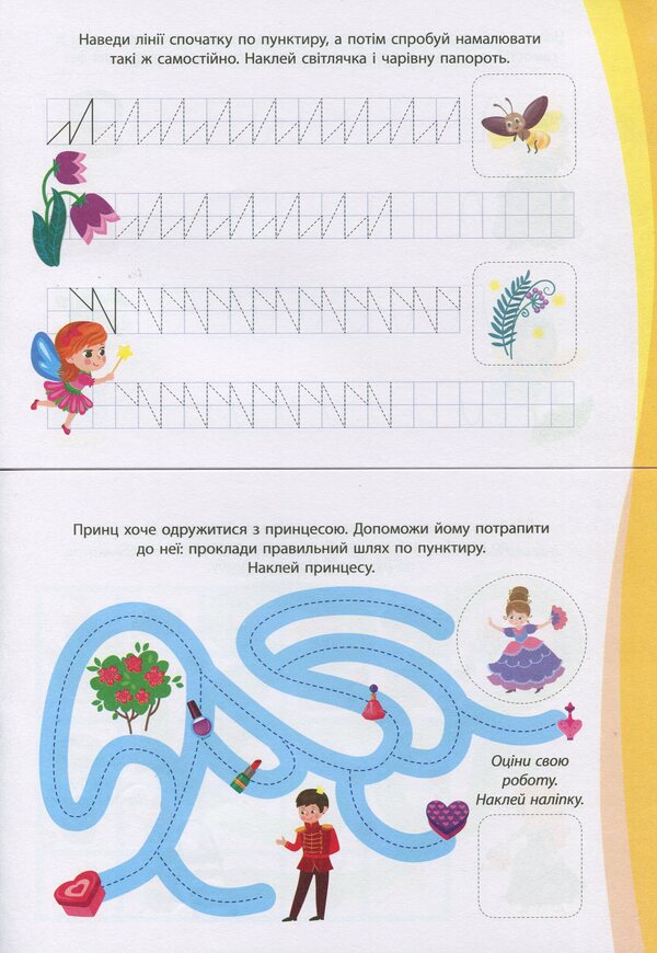 Під час виконання завдань дітям стануть у пригоді яскраві наліпки, а оцінити свою роботу можна спеціальними наліпками-оцінками.Працюючи з виданням, малюк розвине дрібну моторику пальців рук, просторове мислення, уміння орієнтуватися на аркуші паперу, а також підготує руку до письма.SPECIFICATIONS: