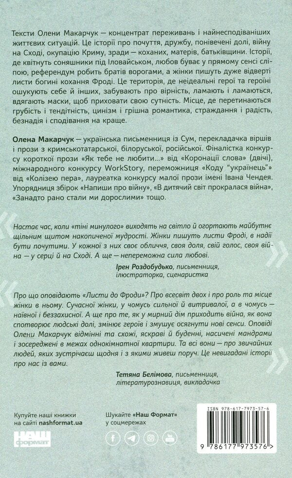 Тексти Олени Макарчук — концентрат переживань і найнесподіваніших життєвих ситуацій. Це історії про почуття, дружбу, понівечені долі, війну на Сході, окупацію Криму, зради — коханих, матерів, батьківщини. історії, де квітнуть соняшники під Іловайськом, любов буває у прямому сенсі сліпою, референдум робить братів ворогами, а жінки пишуть дуже відверті листи богині кохання Фроді. Це територія, де неідеальні герої та героїні ошукують себе й інших, забувають про вірність, ламають і ламаються, вдягають маски, щоб приховати свою сутність. Місце, де перетинаються грубість і тендітність, цинізм і грішна романтика, страждання і радість, безнадія і сподівання на краще.