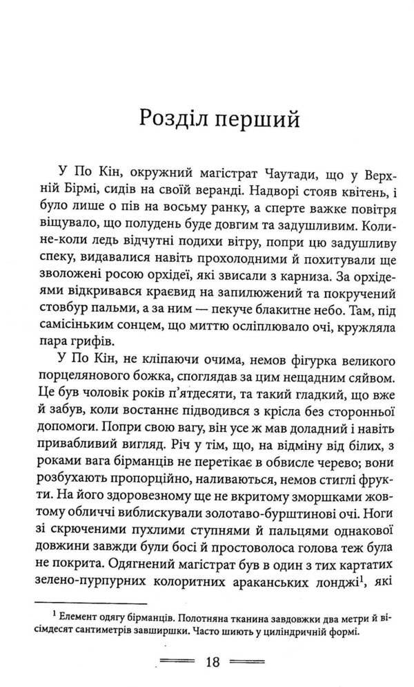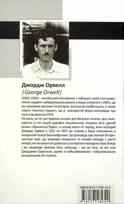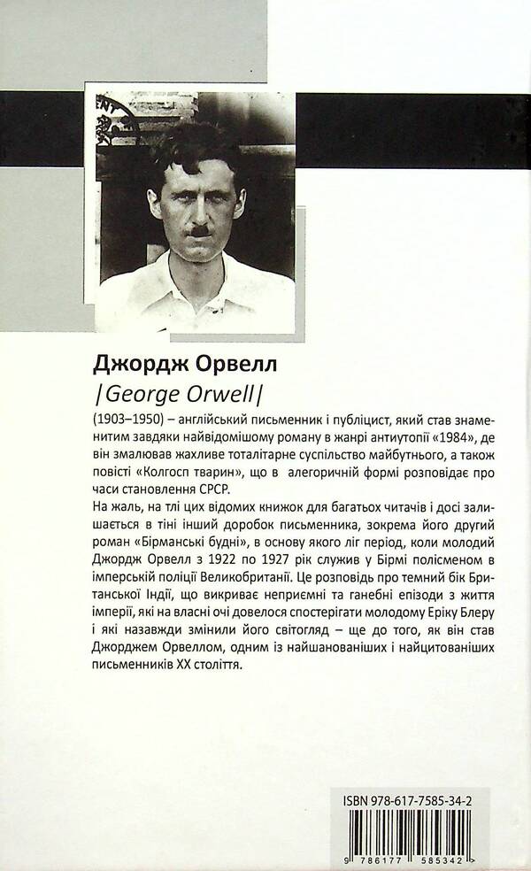 На жаль, на тлі цих відомих книжок для багатьох читачів і досі залишається в тіні інший доробок письменника, зокрема його другий роман 'Бірманські будні', в основу якого ліг період, коли молодий Джордж Орвелл з 1922 по 1927 рік служив у Бірмі полісменом в імперській поліції Великобританії. Це розповідь про темний бік Британської Індії, що викриває неприємні та ганебні епізоди з життя імперії, які на власні очі довелося спостерігати молодому Еріку Блеру і які назавжди змінили його світогляд – ще до того, як він став Джорджем Орвеллом, одним із найшанованіших і найцитованіших письменників ХХ століття.'Бірманські будні' – другий роман у бібліографії Джорджа Орвелла, написаний 1934 року, в якому вже тоді можна помітити зародки тих основних для письменника тем, які згодом ще гучніше і зловісніше прозвучать у культових '1984' і 'Колгоспі тварин'. В основу роману ліг особистий досвід Орвелла, коли він жив у Бірмі, де служив полісменом у колоніальній поліції Великобританії. Цей час знаменує переломну мить у житті Орвелла – саме тоді відбулася трансформація снобістського хлопчика-випускника приватної школи в письменника, який став голосом суспільної совісті.Головний герой роману Флорі – своєрідне альтер-еґо письменника, самотня й нужденна людина, яка втрапила у пастку могутньої системи, що руйнує в людині все хороше. Його оточують люди, з якими у нього немає нічого спільного і яким він не може повністю відкритися, оскільки і бірманці, і британці, і сам Флорі заплямовані колоніальним режимом, в умовах якого їм доводиться жити.SPECIFICATIONS: