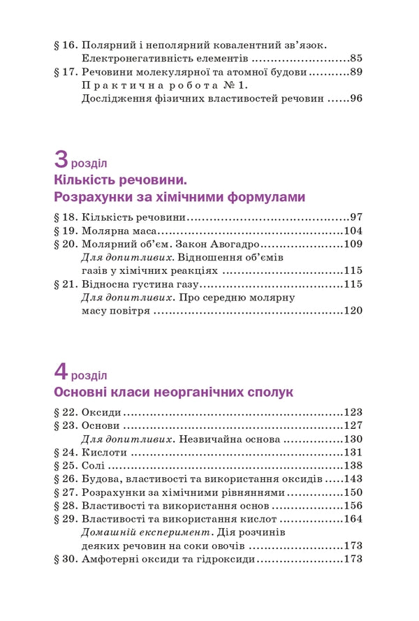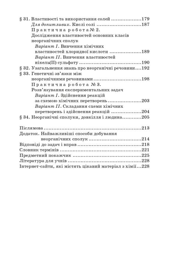 Підручник підготовлено за програмою з хімії для 7—9 класів загальноосвітніх навчальних закладів. Він містить теоретичний матеріал із розділів 'Періодичний закон і періодична система хімічних елементів. Будова атома', 'Хімічний зв’язок і будова речовини', 'Кількість речовини. Розрахунки за хімічними формулами', 'Основні класи неорганічних сполук', практичні роботи, лабораторні досліди, вправи, задачі, додатковий матеріал для допитливих, словник термінів, предметний покажчик, список літератури та інтернет-сайтів.