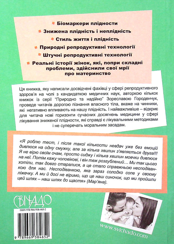 Також у книжці вміщено реальні історії жінок, які подолали проблеми із плідністю та здійснили свої мрії про материнство.SPECIFICATIONS: