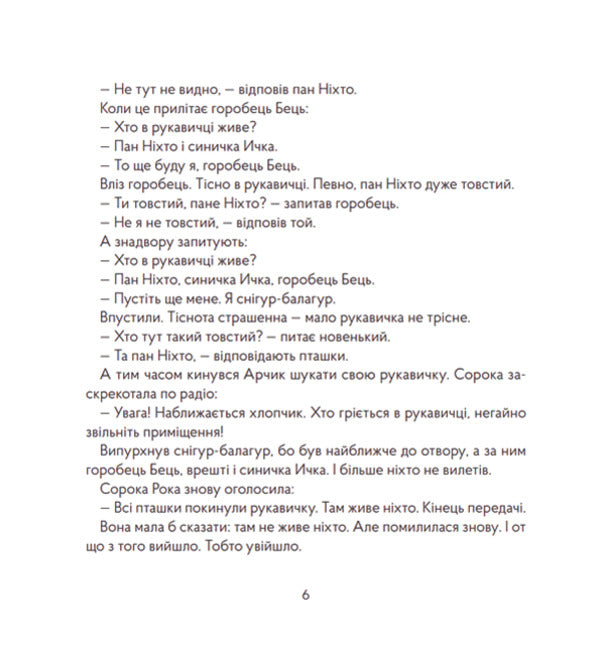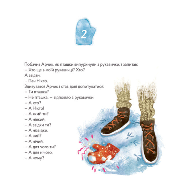 Одного дня Арчик загубив свою рукавичку. А коли знайшов, виявив, що в ній оселився пан Ніхто. Що ж то за дивний пан, улюблені слова якого - 'не' і 'ні'? І чому він не хоче оселитися в рукавичці Арчикового брата, яку той губить уже зумисне. І чому ніхто не може побачити пана Ніхта?