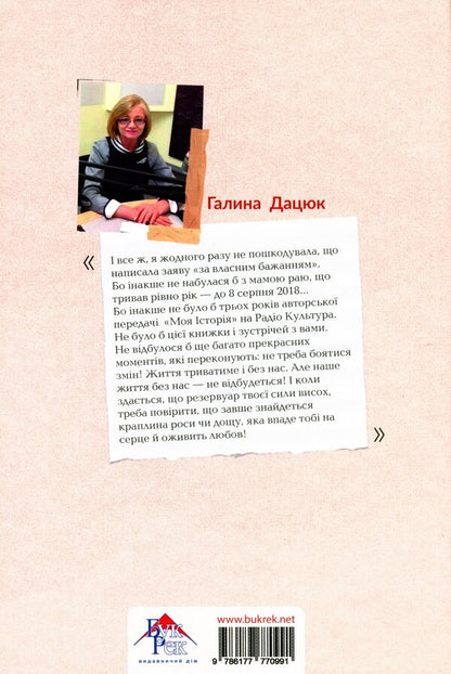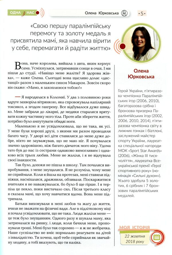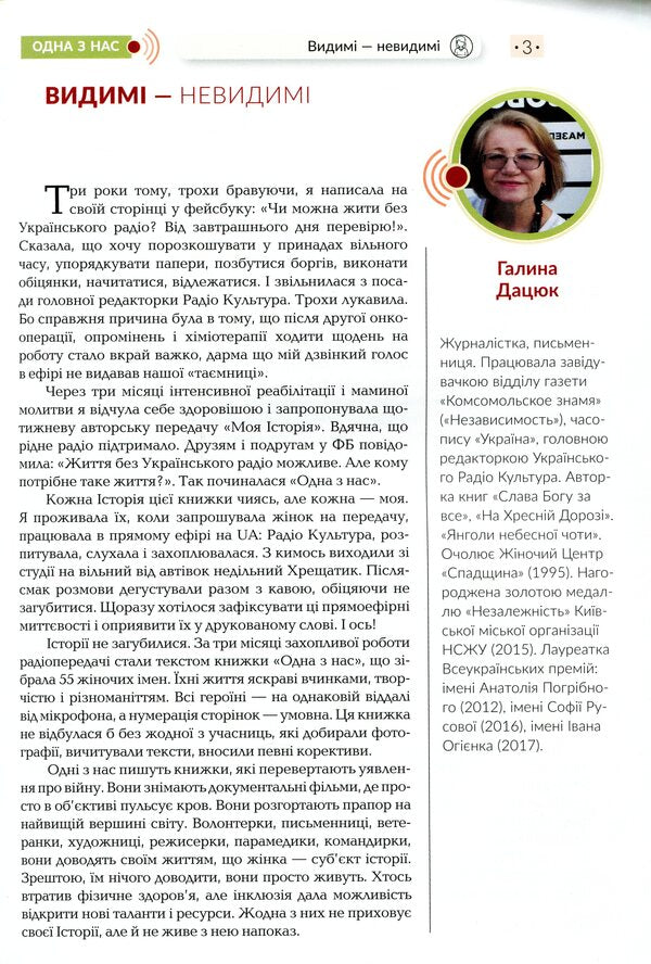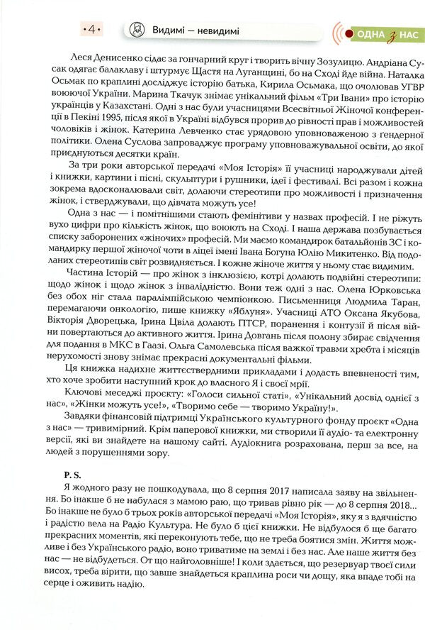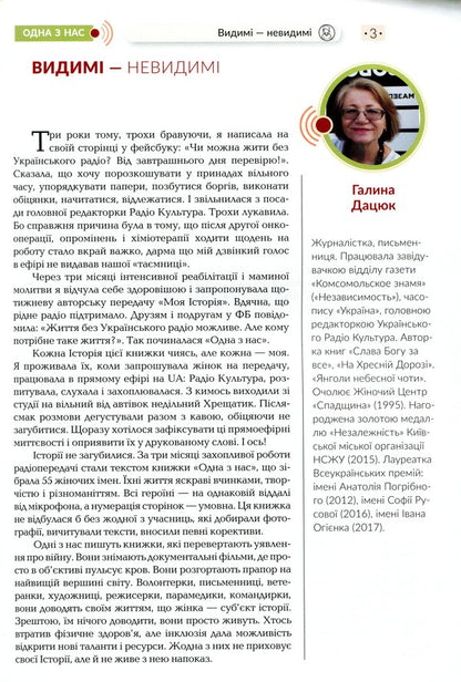 Історії, що оприявлені в книзі, розкажуть вам про одну з нас — українську жінку. І хоч ми підіймаємося на Еверест, отримуємо паралімпійські медалі, пишемо книги та беремо до рук зброю на Сході, усе ж мусимо щодня долати стереотипи про те, що нам щось не під силу. Ми не живемо напоказ, але точно знаємо, що кожна з нас так само має унікальний досвід, про який варто світові розповісти. Завдяки 'Одній з нас' ми робимо до цього перший крок. Наші історії повні натхнення, вони про силу духу та любов — незважаючи на будь-які перешкоди: фізичні чи психологічні. Ми розказали про себе на радіо, про нас ви може прочитати у книзі — паперовій та електронній. А бути ближчими до вас допоможе аудіовидання в особливому форматі — саме для тих, хто може книгу лише послухати.