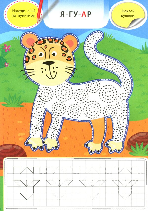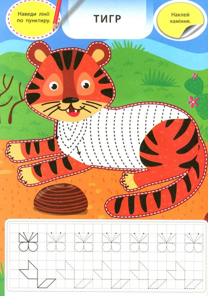Ця книжка познайомить дитину з підводними мешканцями, навчить наводити об’єкти по пунктиру, штрихувати та малювати по клітинках. Малюк матиме можливість пройти захопливий лабіринт у вигляді черепахи, а також вирізати рамочку для фото та змайструвати фігури мешканців моря у форматі 2D. Яскраві ілюстрації та наліпки зроблять роботу більш цікавою. Видання допоможе покращити пам’ять, розвинути увагу й мислення, а також підготувати руку до письма.