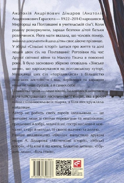 У збірці 'Сільські історії' ідеться про життя та долі людей двох сіл на Полтавщині: Рогозівки під час Другої світової війни та Малого Тікача в повоєнні роки.