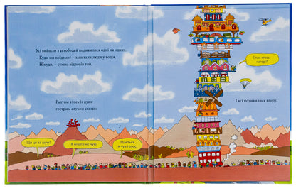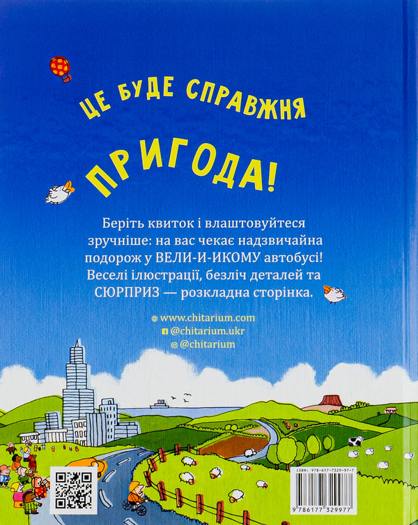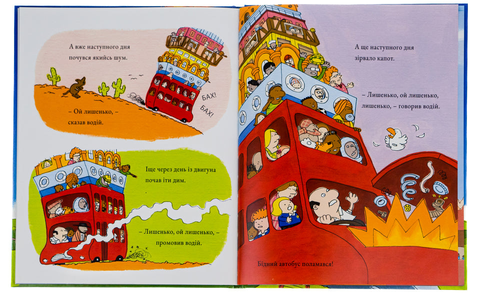 Щодня водій автобуса допиває чашку чаю, одягає куртку і вирушає в дорогу. Щодня чоловік у великій червоній краватці заходить на кільцевій розв’язці, дама з візком заходить біля бібліотеки, а галасливі діти заходять на Кловер-Драйв. Але що, коли одного разу водій поверне на нову дорогу та візьме на борт нових людей? Їх цікава мандрівка матиме дуже непередбачуване закінчення!Дітям обов’язково сподобається величезний розворот з автобусом, який майстерно й зручно схований у книзі. Знайомство з ним стане додатковою грою, під час якої можна дізнатися багато нового.SPECIFICATIONS: