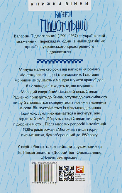 Молодий енергійний сільський юнак Степан Радченко приїздить до Києва, вступає до економічного вишу й сподівається повернутися з новими знаннями на село. Він зустрічається із сільською дівчиною Надійкою, сумлінно навчається в інституті, але гординя й амбіції беруть своє, і Степан вирішує підкорити місто…Після масових репресій інтелігенції 1930-х років, під які потрапив також і Валер’ян Підмогильний, роман 'Місто', як і інші твори письменника, був заборонений до 1989 року. У серії 'Рідне' також вийшли друком книжки В. Підмогильного 'Добрий Бог. Оповідання', 'Невеличка драма'.SPECIFICATIONS: