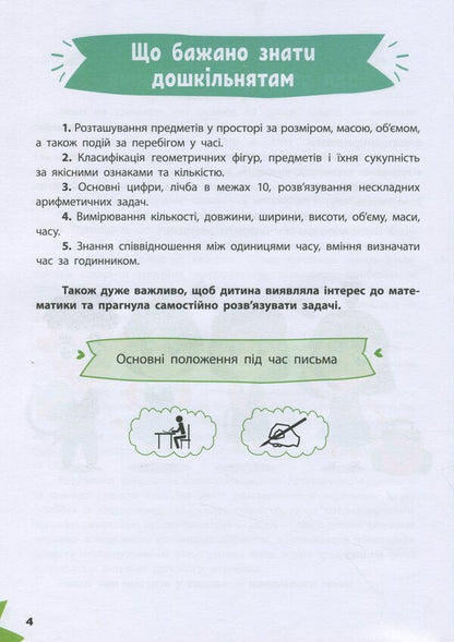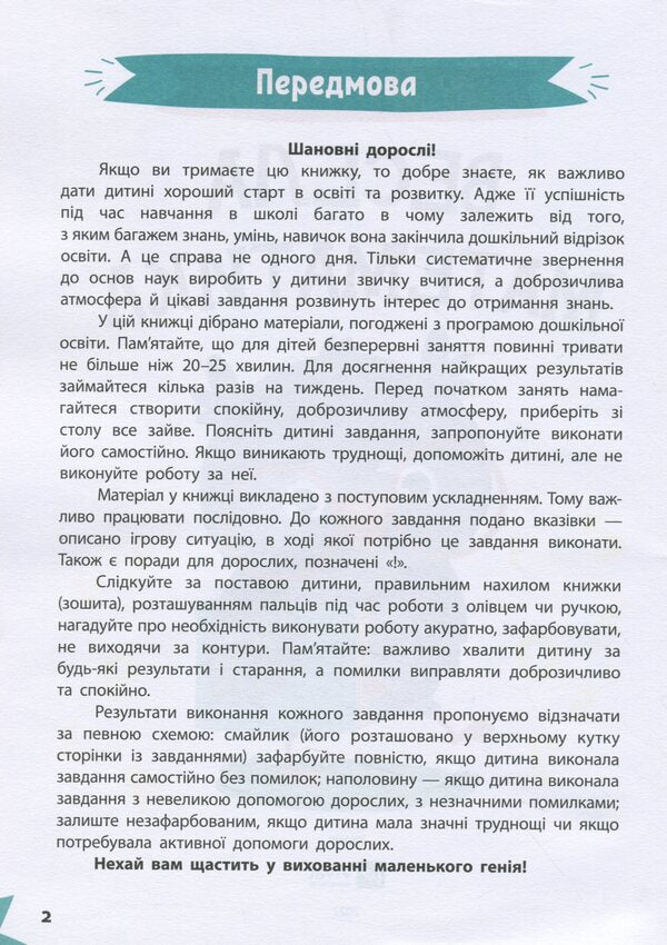 Витрачаючи на одне заняття не більше 20 хвилин, дитина здобуде важливі знання та вміння, опанує нові навички. Регулярно працюючи з нашою книжкою, малюк ознайомиться з цифрами й числами, навчиться розрізняти геометричні фігури, розв’язуватиме математичні приклади й розвиватиме логічне мислення. А дотепні та захопливі завдання перетворять навчання на веселу гру!