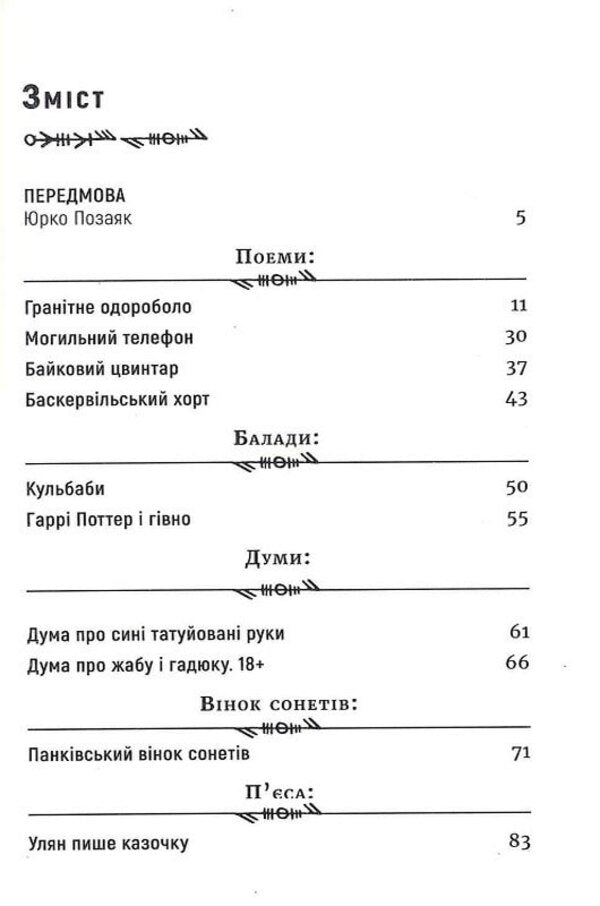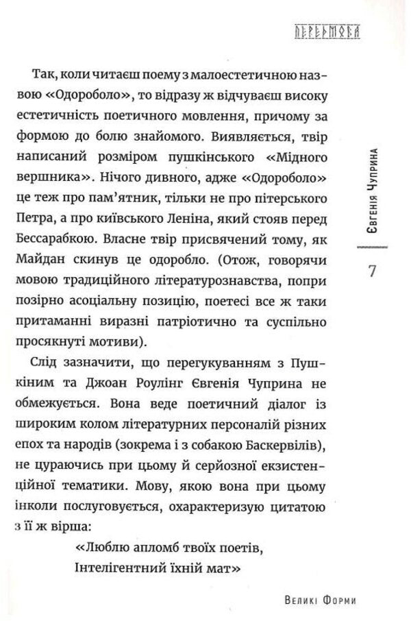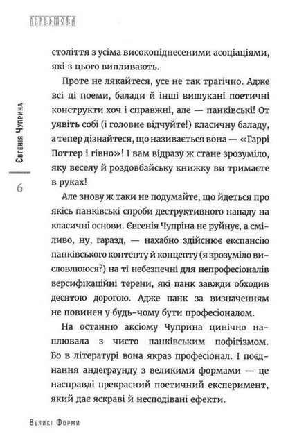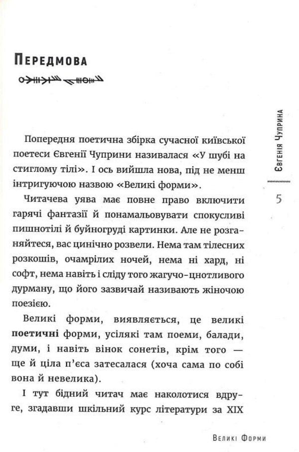 У книзі “Великі форми” зібрані твори, які більші, ніж вірші. Тут є поеми, балади, думи, вінок сонетів і п'єса, де авторка демонструє цілком достатнє для своїх статі й віку володіння академічним віршуванням і ненормативною лексикою, гумор шибеника і строкату ерудицію, а також ділиться знаннями і враженнями щодо письменника Олеся Ульяненка, який, власне, і є спонсором цвинтарної тематики цієї збірки.