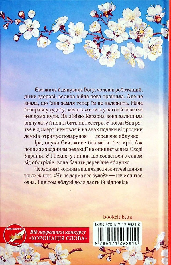 Єва жила й дякувала Богу: чоловік роботящий, дітки здорові, велика війна повз пройшла. Але не знала, що земля їхня тепер не їм належить. Як безправну худобу завантажили їх у вагон й повезли невідомо куди. За лінією Керзона вона залишила рідну хату й попіл батьків і сестри, село яких спалили поляки. У поїзді Єва рятує від смерті немовля й на знак подяки від родини лемків отримує подарунок — дерев’яне яблучко...Іра, онука Єви, живе без мети, без мрії. Аж поки за завданням редакції не опиняється на Сході України. У Пісках, у жінки, що ховається з сином від обстрілів, вона бачить дерев’яне яблучко...Червоним і чорним вишила доля життєві шляхи трьох жінок. 'Чи не дарма все було?' — наче спитає одна. І цвітом яблуні доля дасть їй відповідь.SPECIFICATIONS: