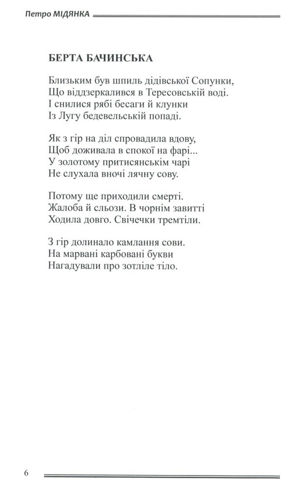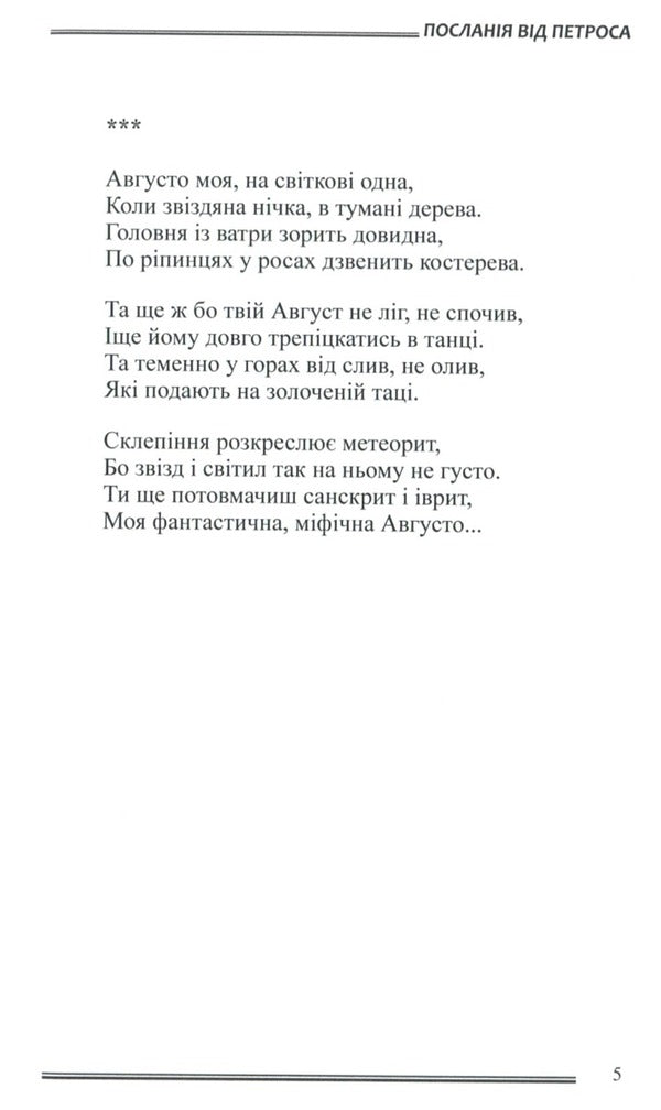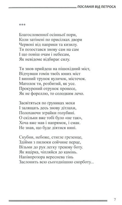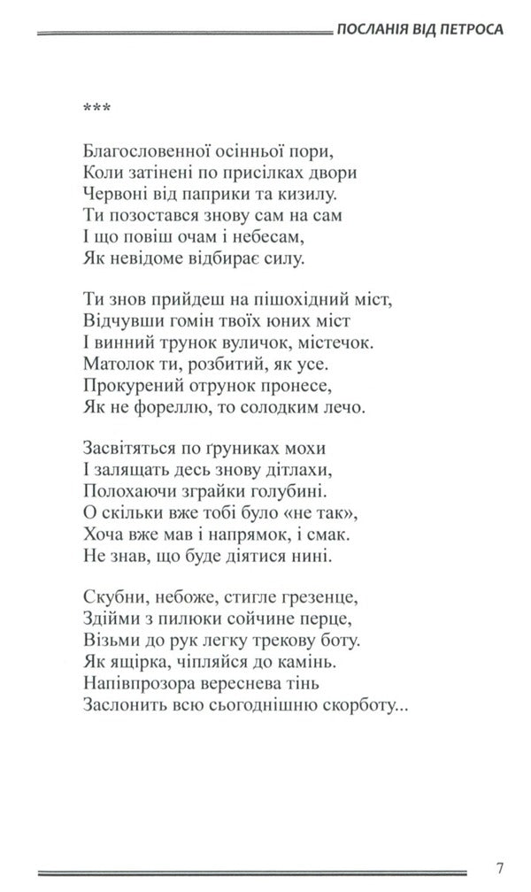 Нова поетична збірка 'Посланія від Петроса' лауреата Національної премії України ім. Тараса Шевченка Петра Мідянки розкриває глибокий духовний світ краян поета. Філософський стержень його творів - непроминальність людського буття в часопросторі. Своєрідність авторського письма додає шарму до художнього світосприйняття найзахіднішого регіону України читачем.