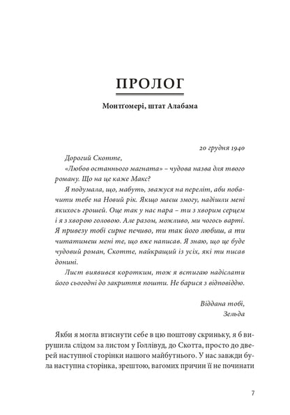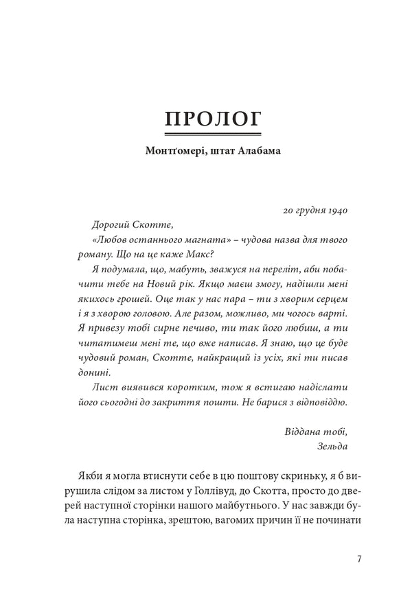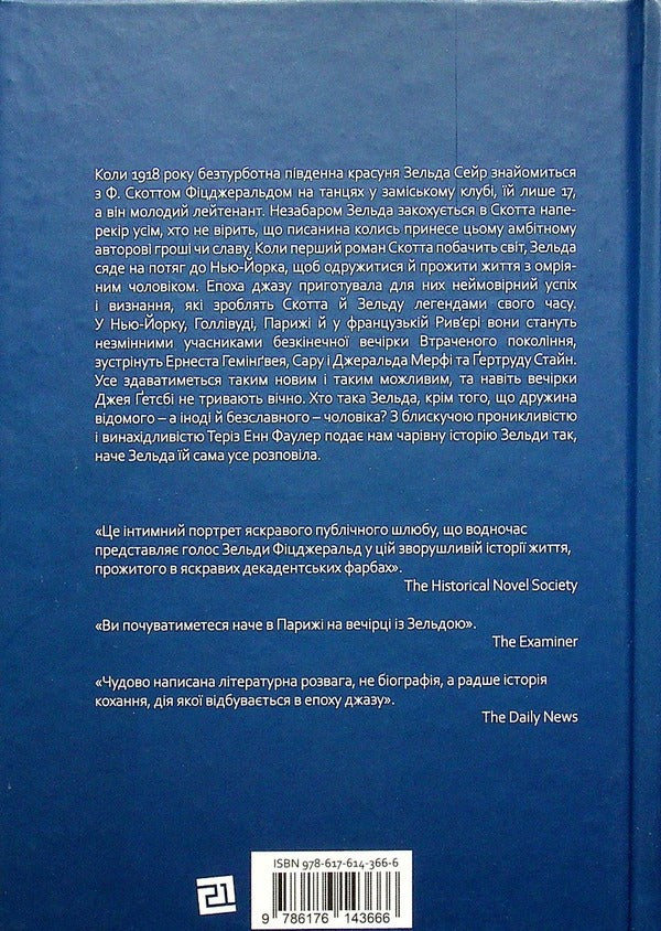 Усі ми знаємо про історію бурхливого кохання Френсіса Скотта Фіцджеральда й Зельди Сейр, про атмосферу нестримних і бурхливих 20–30-х років в Америці й Парижі, про покоління джазу й богемне товариство Фіцджеральдів, Гемінґвея, Ґертруди Стайн, Вірджинії Вулф. Але знаємо про це переважно з розповідей і книжок чоловіків. Роман 'Зельда' пропонує іншу перспективу: це історія життя Зельди, яка закохалася в Скотта й разом із ним творила ту епоху. Написана чудовим легким стилем, ця драматична й заснована на документальних фактах оповідь відкриває нам захопливий, але й суперечливий світ слави, успіху, амбіцій і водночас невпевненості в собі, любові та зрад, нестримного драйву і хвороби. Нарешті Зельда Фіцджеральд здобуває власний голос і виходить з тіні свого чоловіка на перший план історії. Вона на це заслужила.