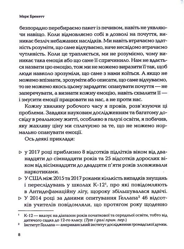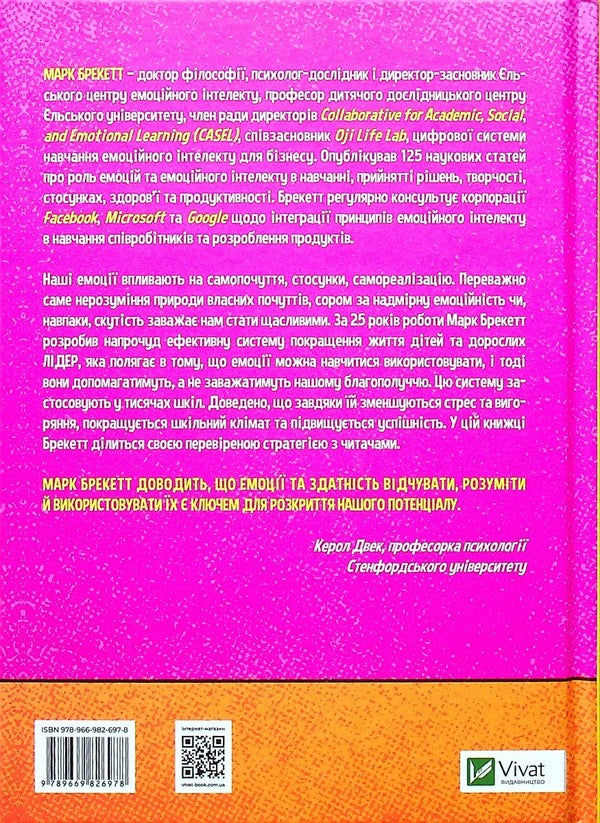 Наші емоції впливають на самопочуття, стосунки, самореалізацію. Переважно саме нерозуміння природи власних почуттів, сором за надмірну емоційність чи, навпаки, скутість заважає нам стати щасливими. За 25 років роботи Марк Брекетт розробив напрочуд ефективну систему покращення життя дітей та дорослих ЛІДЕР, яка полягає в тому, що емоції можна навчитися використовувати, і тоді вони допомагатимуть, а не заважатимуть нашому благополуччю. Цю систему застосовують у тисячах шкіл. Доведено, що завдяки їй зменшуються стрес та вигоряння, покращується шкільний клімат та підвищується успішність. У цій книжці Брекетт ділиться своєю перевіреною стратегією з читачами.