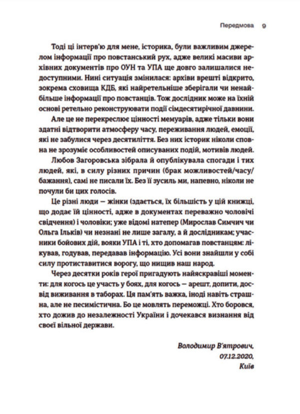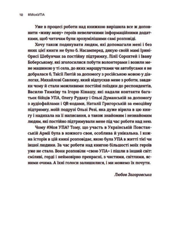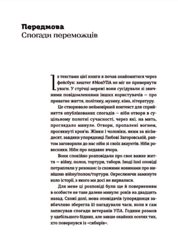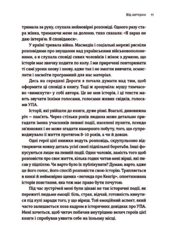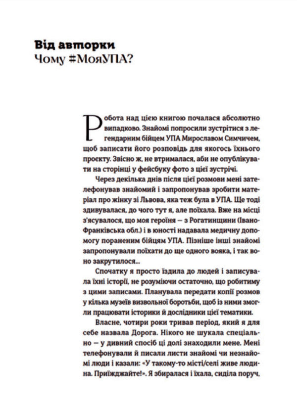 У цій книзі — 39 розповідей про людей, які або воювали в УПА, або допомагали українській армії боротися за незалежність України майже 100 років тому. Книга про людей, які зазнали переслідувань, арештів, репресій і які залишилися незламними й нескореними у своїй боротьбі. Книга-сповідь, яку варто прочитати, аби осмислити велику сторінку історії України через призму людської долі.