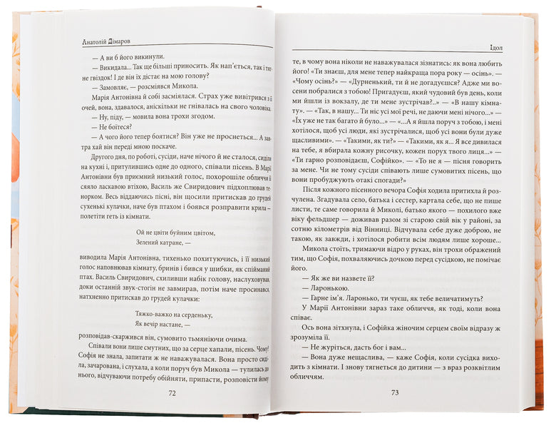 Його роман 'Ідол' (1961) зворушує й змушує замислитися над складними питаннями. До яких непередбачуваних наслідків, як для самої жінки, так і для її дитини, може призвести сліпе материнське почуття, надмірна опіка над дитиною? Чому діти-ідоли, які змалку отримували 'все найкраще', часом виростають черствими, грубими, себелюбними, жорстокими і зрадливими?Чи знайдуть герої роману 'Його сім'я' (1956) шляхи зближення, коли вгасає подружня любов, зростає невдоволення одне одним, коли щоденні сварки, взаємні звинувачення й образи ведуть до розпаду сім’ї? Нагальні загальнолюдські проблеми порушує Анатолій Дімаров у своїх сімейних романах, котрі й сьогодні викликають неабиякий інтерес читачів.SPECIFICATIONS: