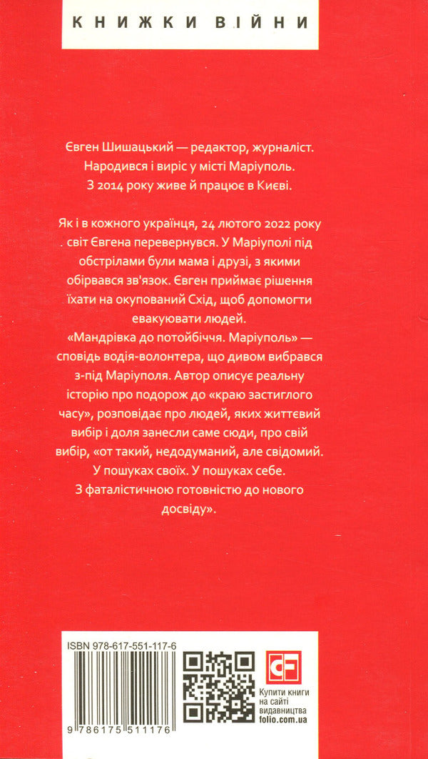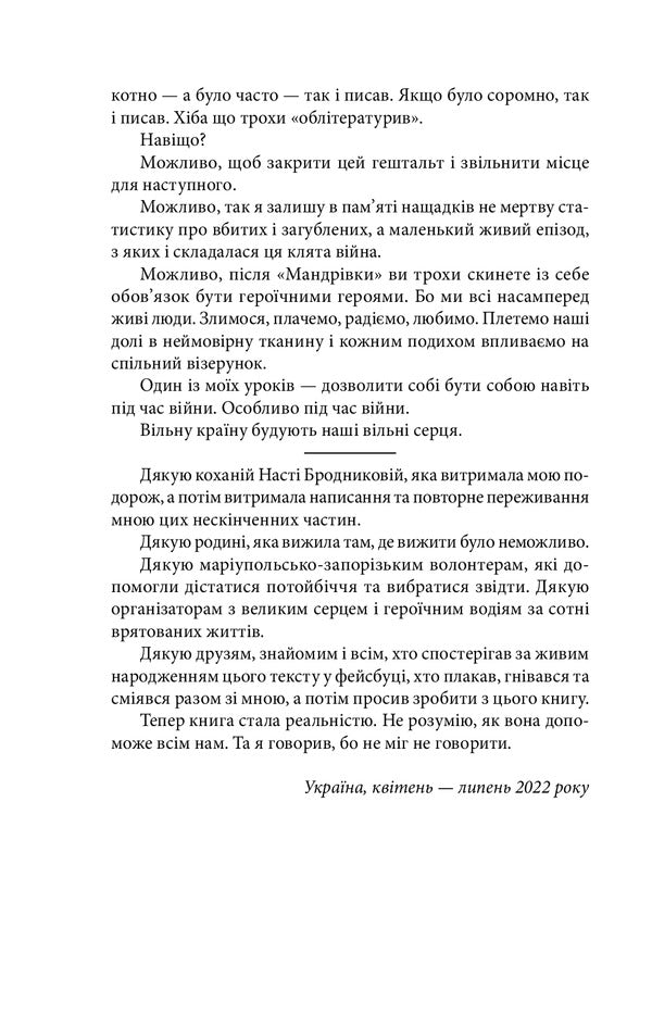 Як і в кожного українця, 24 лютого 2022 року світ Євгена перевернувся. У Маріуполі під обстрілами були мама і друзі, з якими обірвався зв’язок. Євген приймає рішення їхати на окупований Схід, щоб допомогти евакуювати людей.'Мандрівка до потойбіччя. Маріуполь' — сповідь водія-волонтера, що дивом вибрався з-під Маріуполя. Автор описує реальну історію про подорож до 'краю застиглого часу', розповідає про людей, яких життєвий вибір і доля занесли саме сюди, про свій вибір, 'от такий, недодуманий, але свідомий. У пошуках своїх. У пошуках себе. З фаталістичною готовністю до нового досвіду'.SPECIFICATIONS: