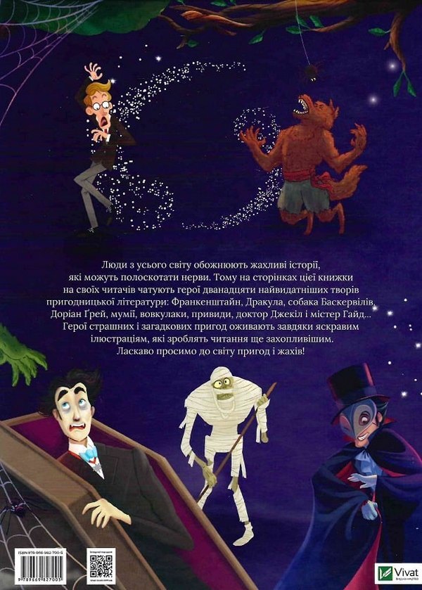 Люди з усього світу обожнюють жахливі історії, які можуть полоскотати нерви. Тому на сторінках цієї книжки на своїх читачів чатують герої дванадцяти найвидатніших творів пригодницької літератури: Франкенштайн, Дракула, собака Баскервілів, Доріан Ґрей, мумії, вовкулаки, привиди, доктор Джекіл і містер Гайд... Герої страшних і загадкових пригод оживають завдяки яскравим ілюстраціям, які зроблять читання ще захопливішим. Ласкаво просимо до світу пригод і жахів!