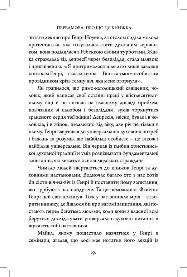 Генрі Ноуен є найкращим провідником на цьому шляху, який вимагає духовної проникливості, відповідальності й цілеспрямованості, щоб перебороти глухоту й опір і стати вільними смиренними людьми, які чують голос Божий – навіть тоді, коли він кличе до невідомих місць.