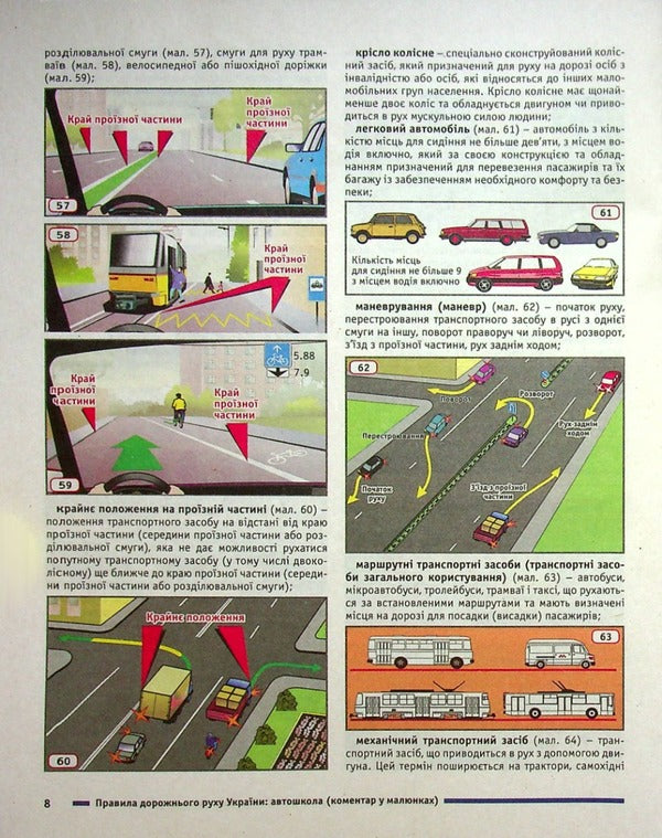 Видання містить понад 550 детальних ілюстрованих коментарів до чинних Правил дорожнього руху України, які допоможуть краще засвоїти матеріал і ефективно застосовувати його на практиці. Органічна єдність офіційного тексту ПДР і коментарів у малюнках полегшить вивчення Правил, що в свою чергу дасть змогу краще орієнтуватися в реальних дорожніх ситуаціях, швидко і правильно приймати рішення. Особливу увагу приділено складним для сприйняття темам ('Дорожні знаки', 'Дорожня розмітка', 'Сигнали регулювальника' та ін.). У посібнику наведено штрафи і відповідальність за порушення ПДР з урахуванням останніх змін в Кодексі України про адміністративні правопорушення, а також алгоритм послідовності дій водія у разі ДТП.