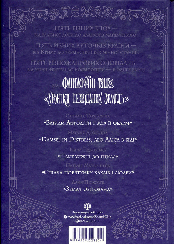 'Кожне оповідання цієї збірки від відомих українських письменниць, учасниць літературного ютуб-проєкту 'Фантастичні talk(s)' — це своєрідний маркер-дороговказ на часопросторовій мапі України. 15-й рік до нашої ери, 1540-й, 1941-й, початок ХХІІІ століття… У різні епохи та куточки нашої країни (і навіть її космічних поселень) приведуть вас 'Хроніки незвіданих земель'. Усюди — під давніми пісками Причорномор’я, в замкових мурах Поділля, під пластами чорного золота Донеччини, на старовинних вулицях Львова і навіть на українській станції на супутнику Марса — на вас чекають відкриття. Для когось це буде розгадка містичної історії, для когось — осяяння від історії давньої, а для когось — розуміння історії, яку українці пишуть просто зараз.