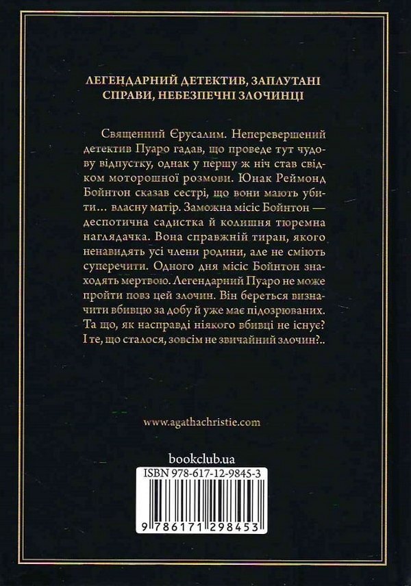 Священний Єрусалим. Неперевершений детектив Пуаро гадав, що проведе тут чудову відпустку, однак у першу ж ніч став свідком моторошної розмови. Юнак Реймонд Бойнтон сказав сестрі, що вони мають убити… власну матір. Заможна місіс Бойнтон — деспотична садистка й колишня тюремна наглядачка. Вона справжній тиран, якого ненавидять усі члени родини, але не сміють суперечити. Одного дня місіс Бойнтон знаходять мертвою. Легендарний Пуаро не може пройти повз цей злочин. Він береться визначити вбивцю за добу й уже має підозрюваних. Та що, як насправді ніякого вбивці не існує? І те, що сталося, зовсім не звичайний злочин…
