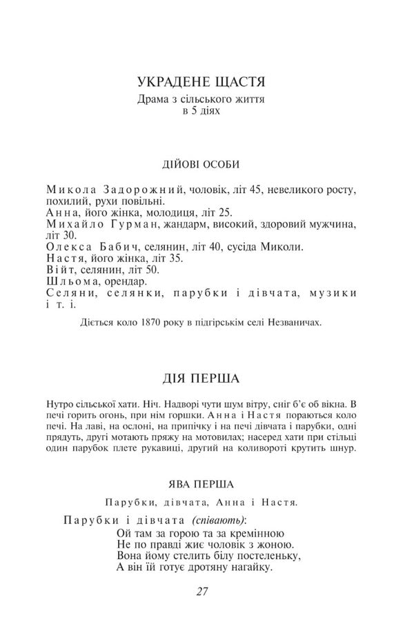 Однiєю з найпопулярніших в українській літературі та найбільш знаковою для багатьох театрів і сьогодні є п'єса Івана Франка 'Украдене щастя', в центрі якої три постаті: підстаркуватий селянин, його молода дружина та її коханий — жандарм. Драма Франка переростає у трагедію високої напруги, притчу про те, що на чужому нещасті свого щастя не збудуєш.
