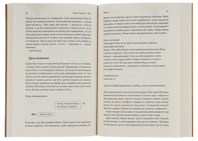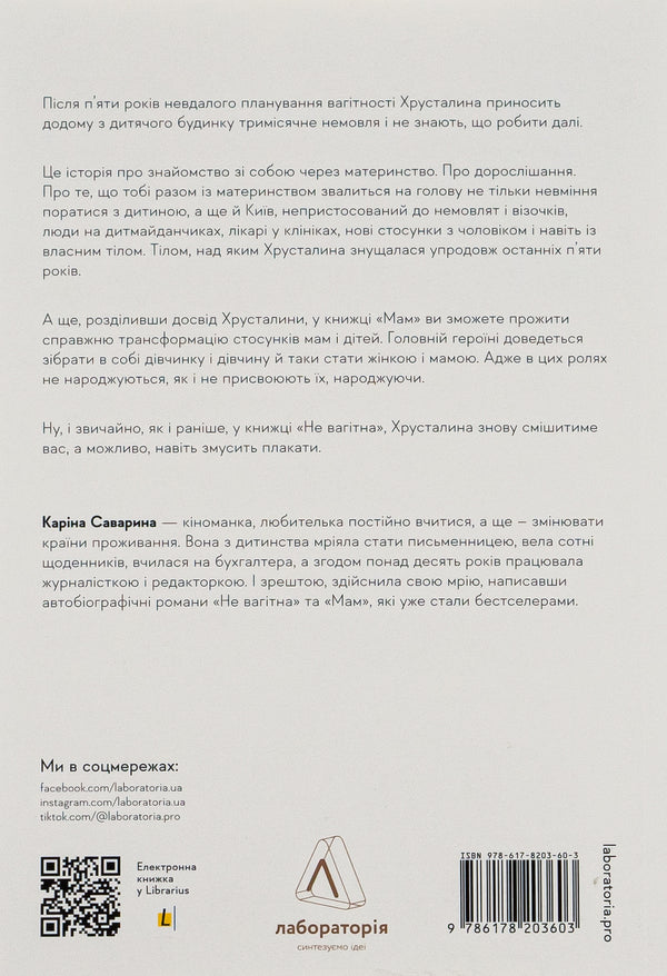 'Мам' — це продовження першого роману авторки 'Не вагітна'. Тут Хрусталина не тільки вчиться піклуватися і співіснувати разом з усиновленою дитиною, а й намагається змиритися із неприйняттям суспільства, містом, яке абсолютно не пристосоване для немовлят, непривітними лікарями, новими стосунками із чоловіком і навіть із власним тілом.Як і перша книжка, 'Мам' написана на основі справжнього досвіду авторки. Відверто, іноді з іронією, а іноді із болем, вона відтворює трансформацію стосунків матері і дитини. І щоб стати мамою героїні доведеться пройти чимало, а передовсім — почути саму себе.SPECIFICATIONS: