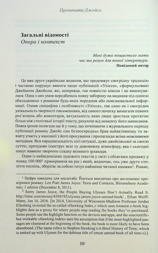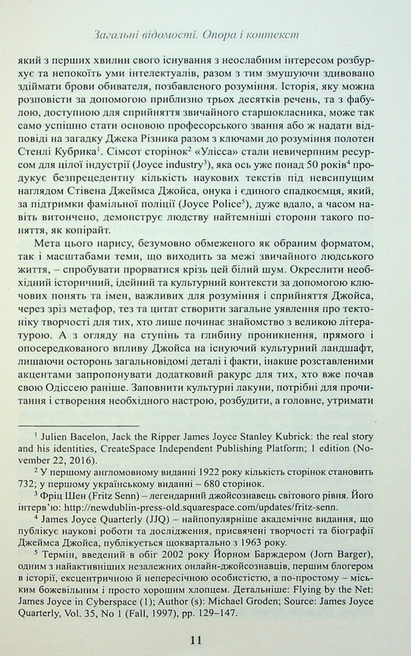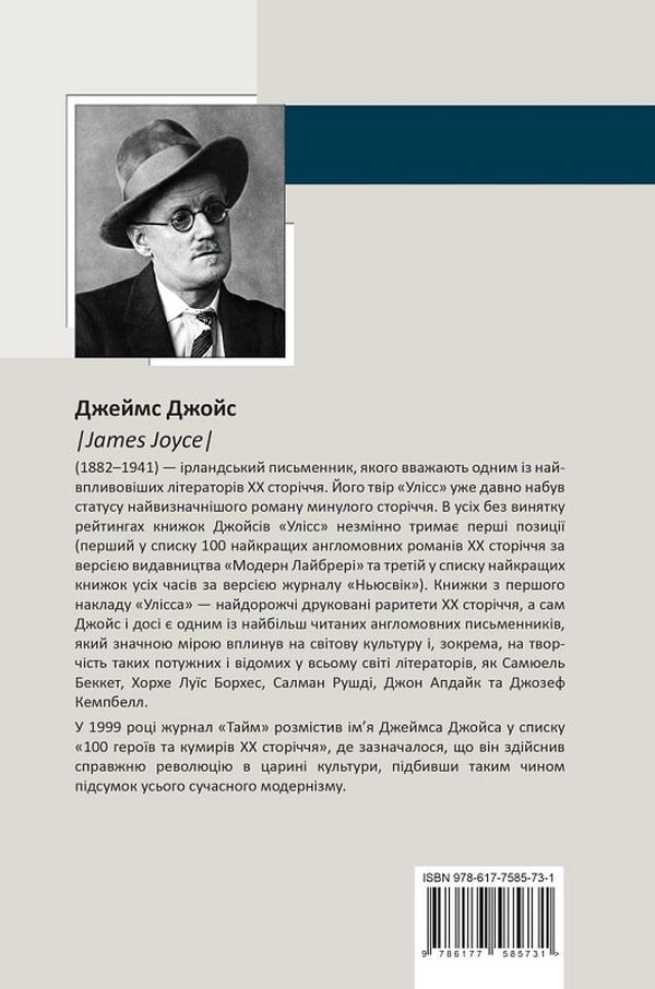 Джеймс Джойс (1882–1941) — ірландський письменник, якого вважають одним із найвпливовіших літераторів ХХ сторіччя. Його твір 'Улісс' уже давно набув статусу найвизначнішого роману минулого сторіччя. В усіх без винятку рейтингах книжок Джойсів 'Улісс' незмінно тримає перші позиції (перший у списку 100 найкращих англомовних романів ХХ сторіччя за версією видавництва 'Модерн Лайбрері' та третій у списку найкращих книжок усіх часів за версією журналу 'Ньюсвік'). Книжки з першого тиражу 'Улісса' — найдорожчі друковані раритети ХХ сторіччя, а сам Джойс і досі є одним із найбільш читаних англомовних письменників, який значною мірою вплинув на світову культуру і, зокрема, на творчість таких потужних і відомих у всьому світі літераторів, як Самюель Беккет, Хорхе Луїс Борхес, Салман Рушді, Джон Апдайк та Джозеф Кемпбелл.